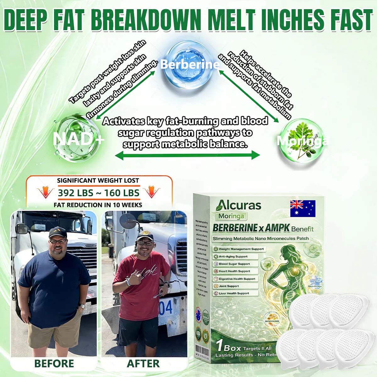 ✅ Alcuras®𝐌𝐚𝐫𝐢𝐧𝐠𝐚 · 𝐁𝐞𝐞 𝐯𝐞𝐧𝐚𝐊 · 𝐁𝐞𝐫𝐛𝐞𝐫𝐢𝐧𝐞 × 𝐍𝐀𝐃+ 𝟖-𝐢𝐧-𝟏 𝐀𝐝𝐯𝐚𝐧𝐜𝐞𝐝 𝐍𝐚𝐧𝐚 𝐌𝐢𝐜𝐫𝐚𝐧𝐞𝐞𝐝𝐥𝐞 𝐏𝐚𝐭𝐜𝐡 breaking away from the burden of traditional injectable or oral weight-loss products. this advanced nano microneedle transdermal delivery system gently and steadily releases active ingredients for up to 8 hours. Core ingredients Moringa and Berberine work synergistically to support appetite management and lipid metabolism. making fat loss feel more natural and effortless—without extreme dieting or physical strain. At the same time. NAD⁺ supports cellular energy levels and skin firmness. helping maintain a healthy. well-toned appearance during body-weight changes. The overall formula is gentle and stable. offering a more comfortable experience for those seeking an effective. non-irritating. and non-injectable approach to weight management.